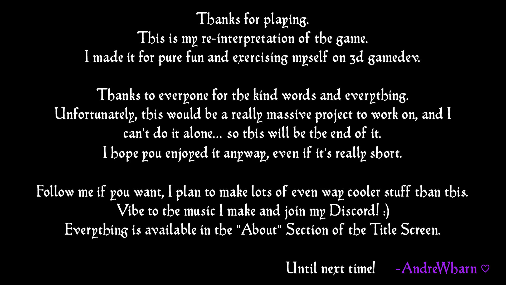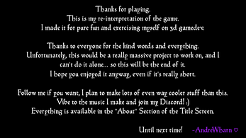 It wasn't originally supposed to be 3D, but I wanted to have fun with experimentation and exercising. So I did it like that. I'd say this took around 20 days to make (+2 for the actual released version), and even if it's incomplete, I hope you enjoy it!